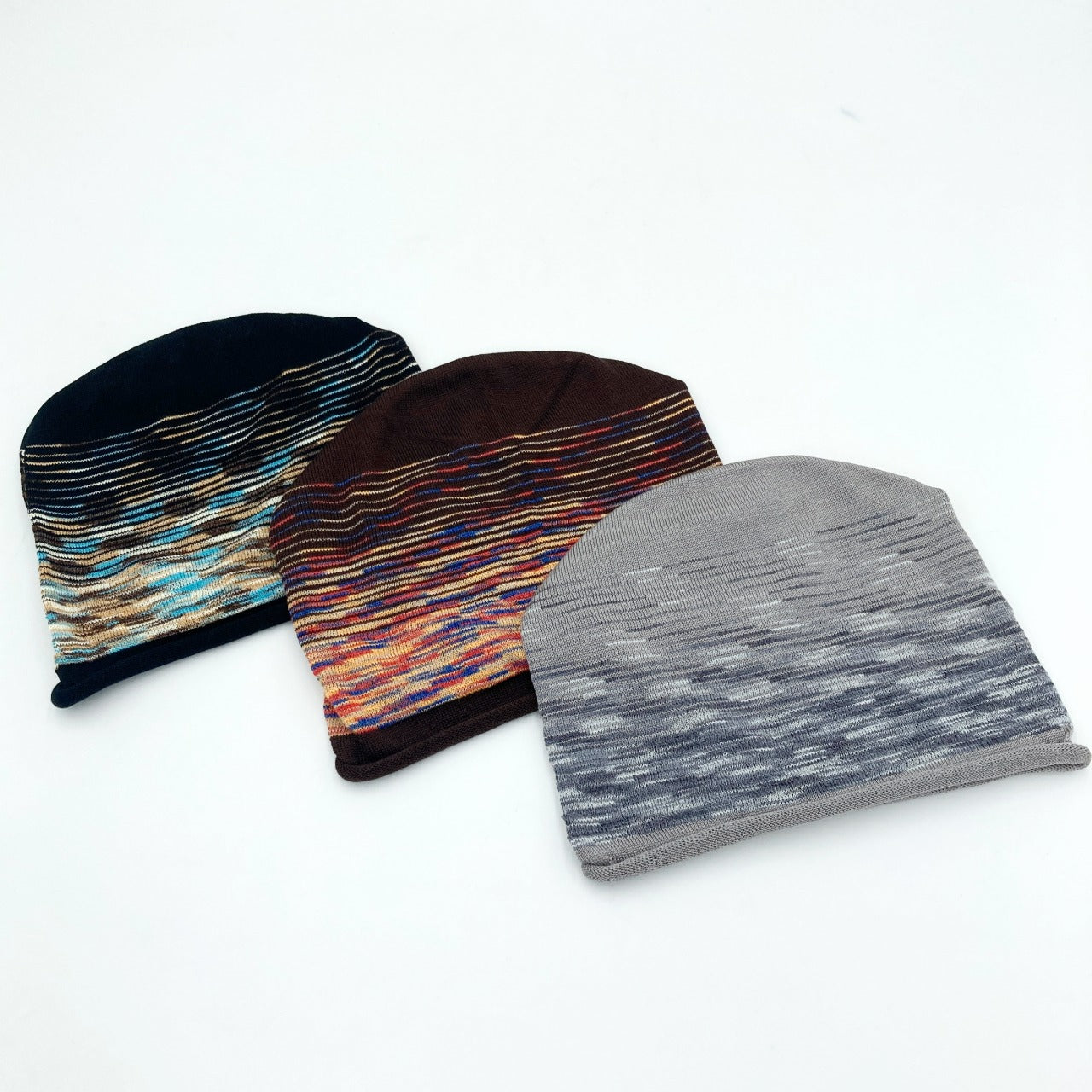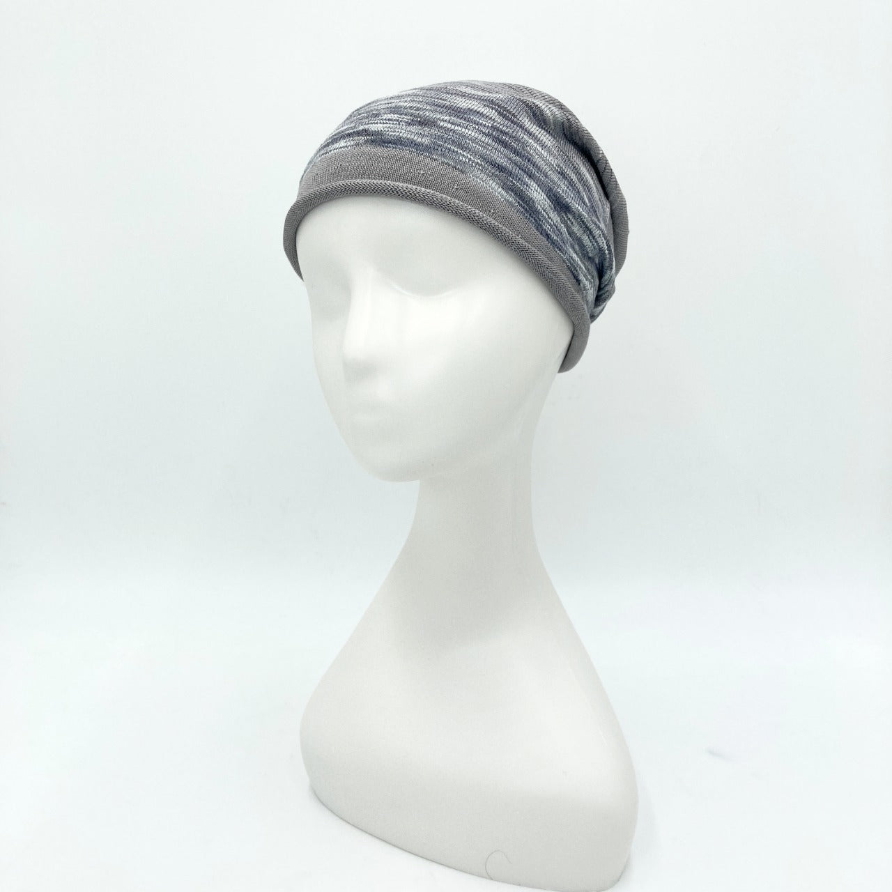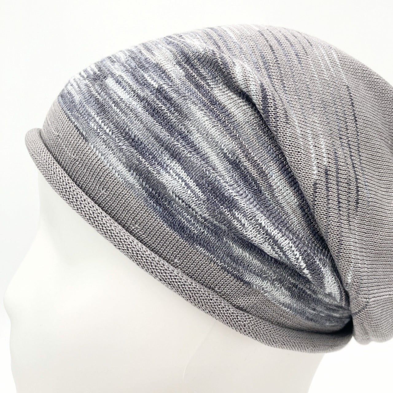 シルクの細い糸でグラデーション模様編みした薄くて軽いワッチです。洗えるので清潔におかぶりいただけます。