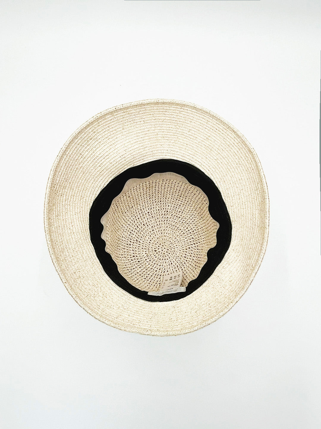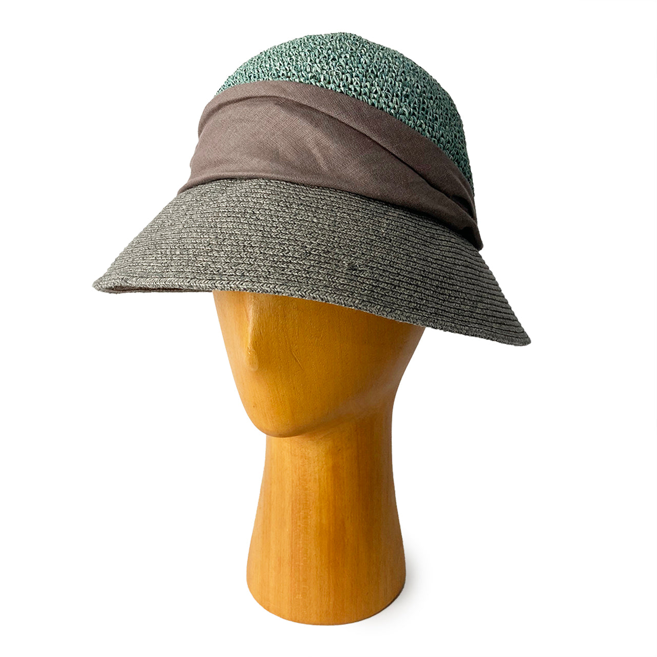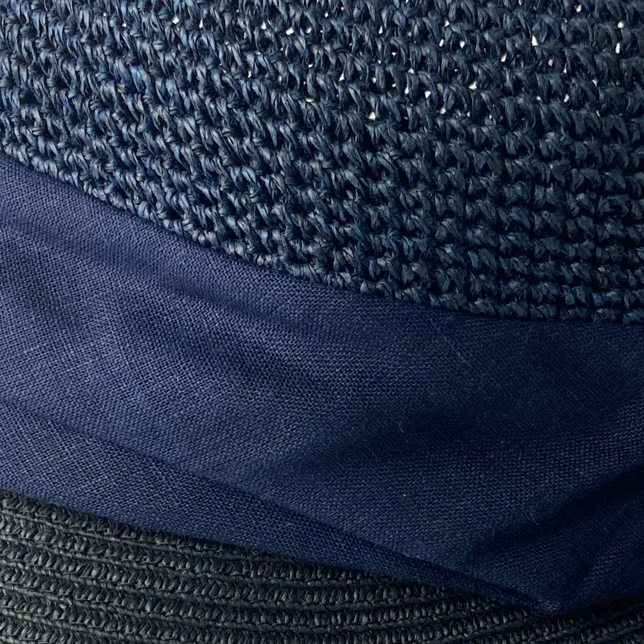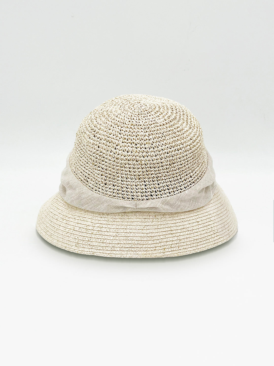 クラウンを細編みにして庇がブレード、腰は麻生地でドレープのアクセント。このハットが洗えるなんて嬉しいかぎり!