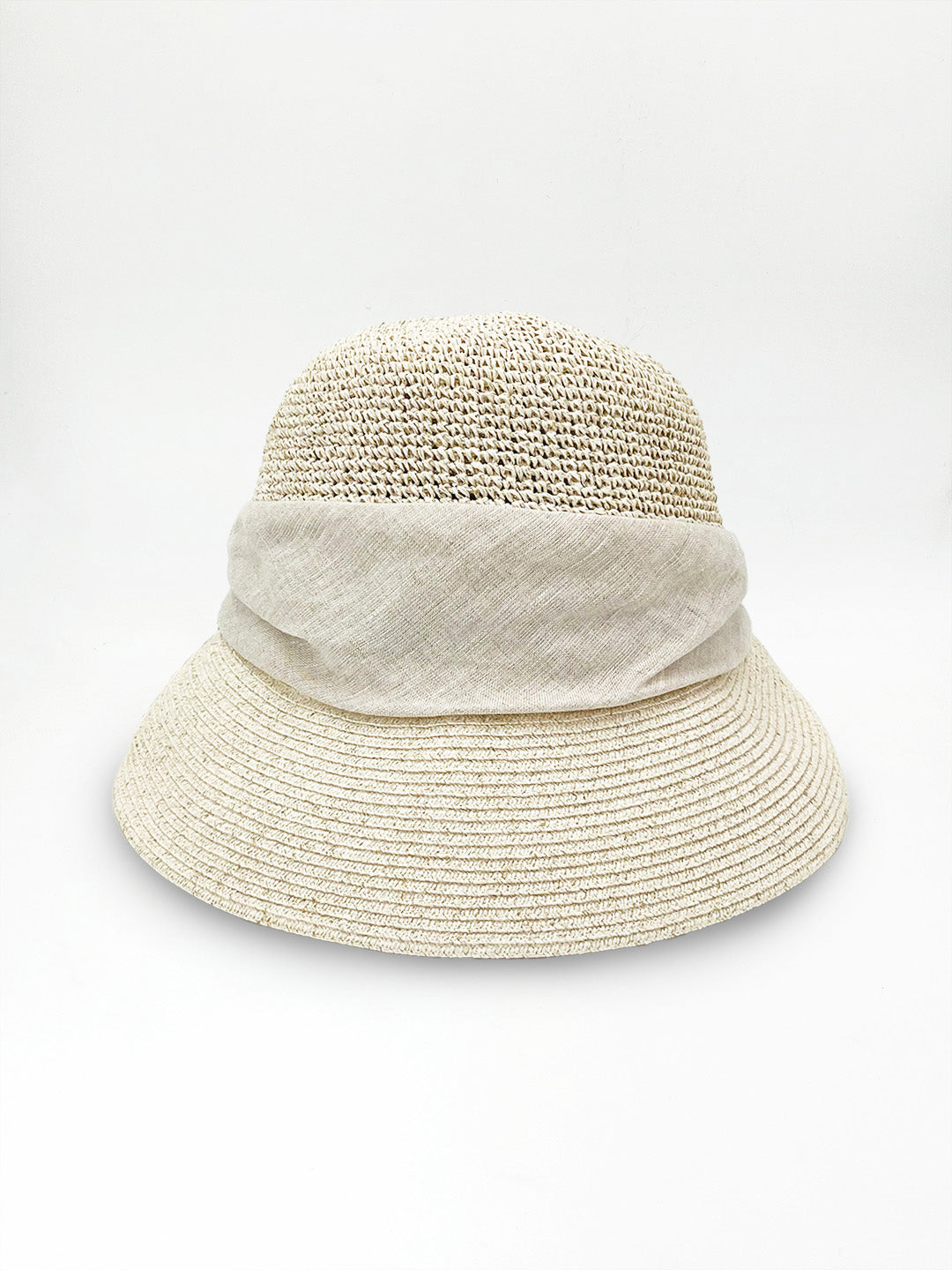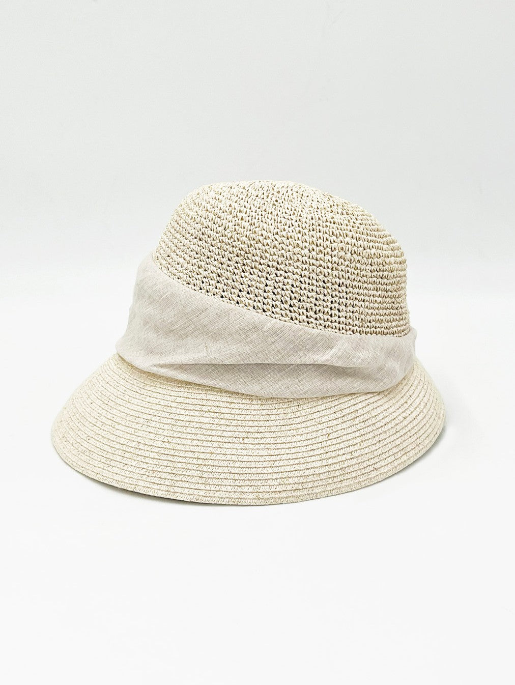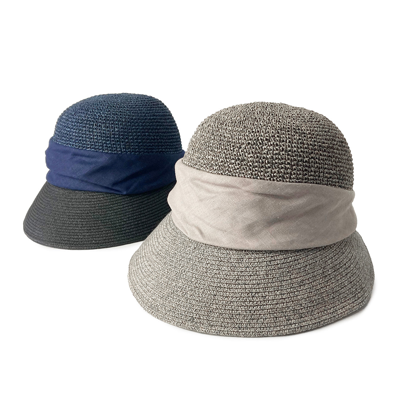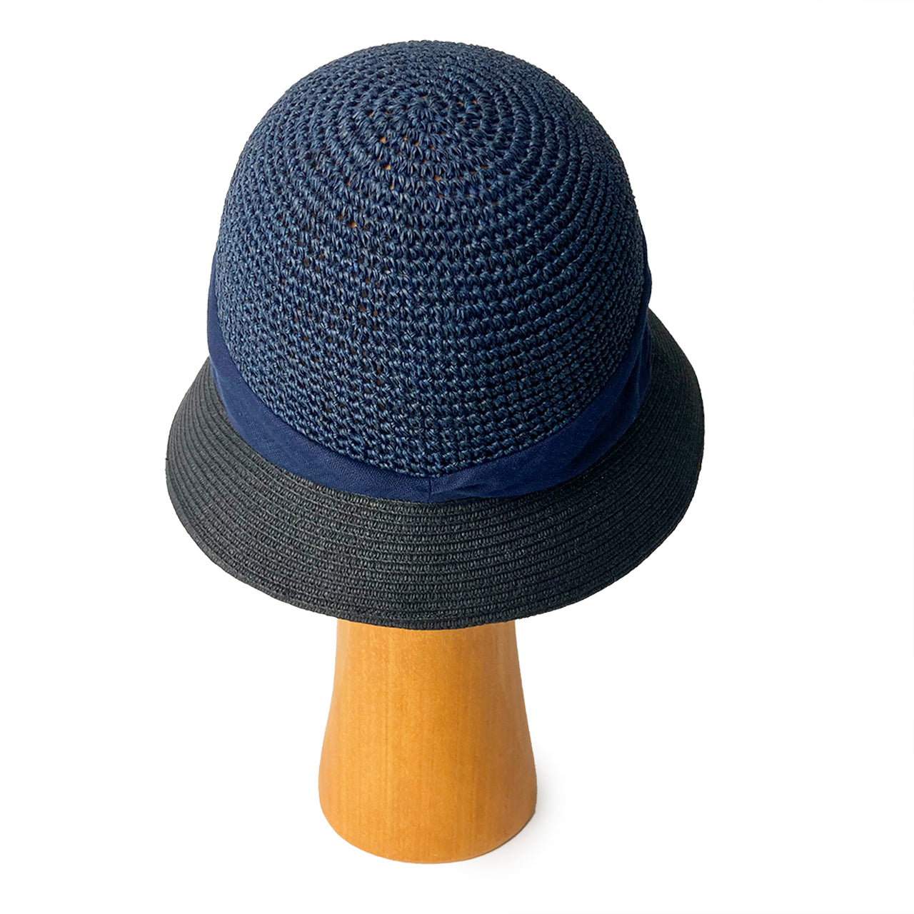クラウンを細編みにして庇がブレード、腰は麻生地でドレープのアクセント。このハットが洗えるなんて嬉しいかぎり!