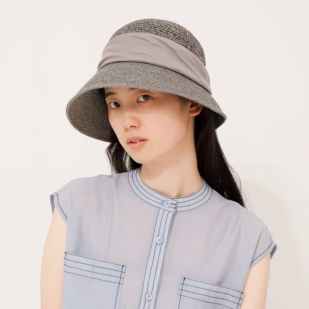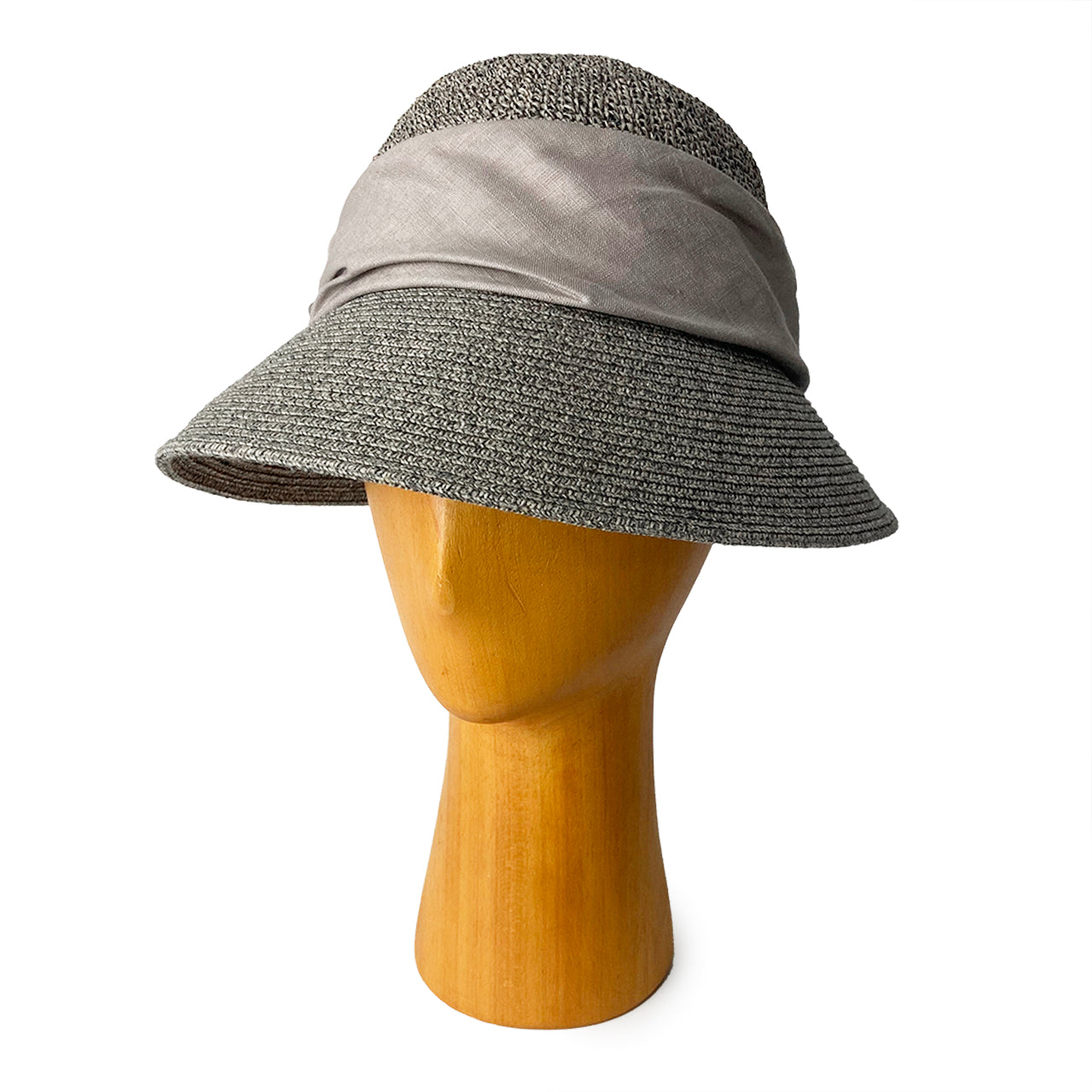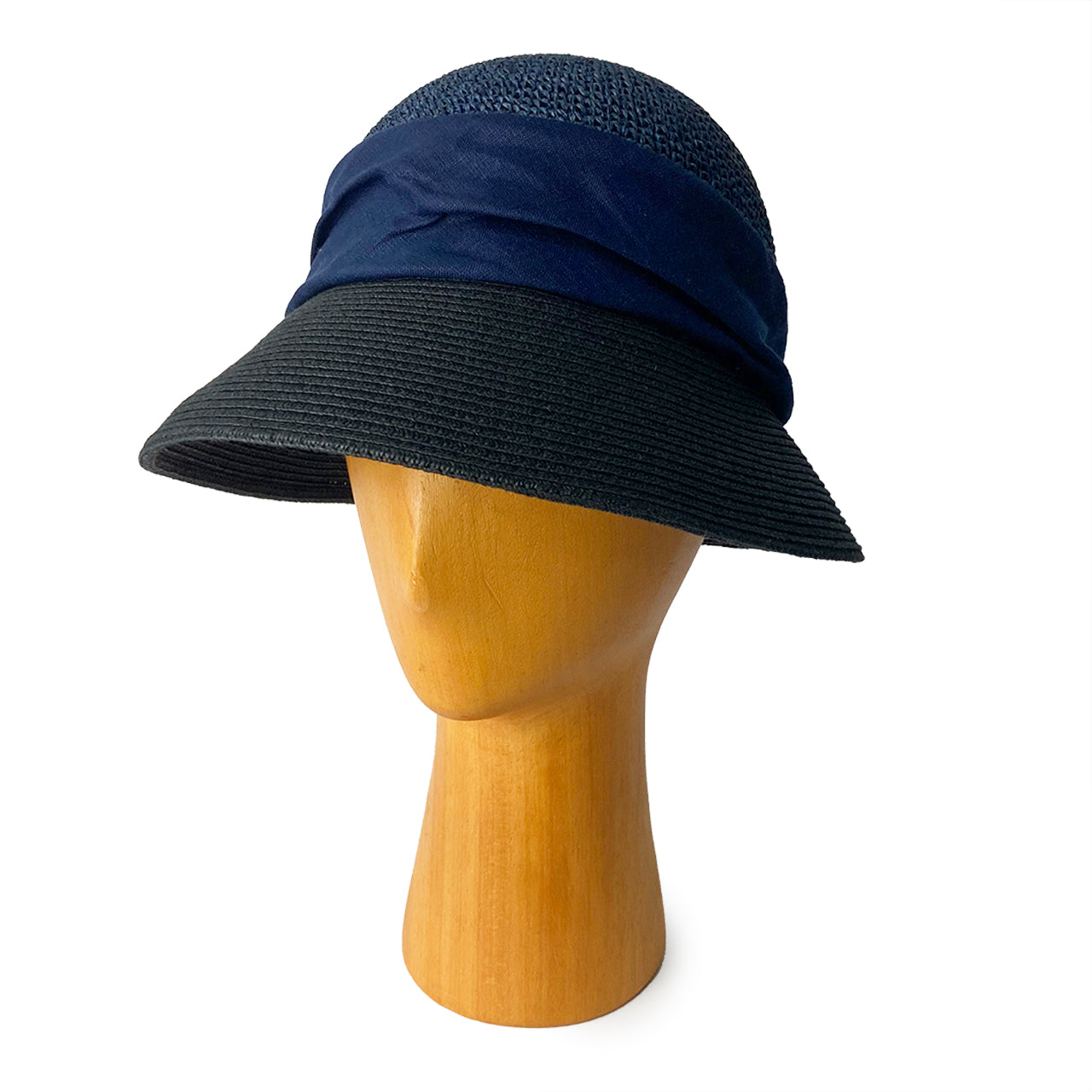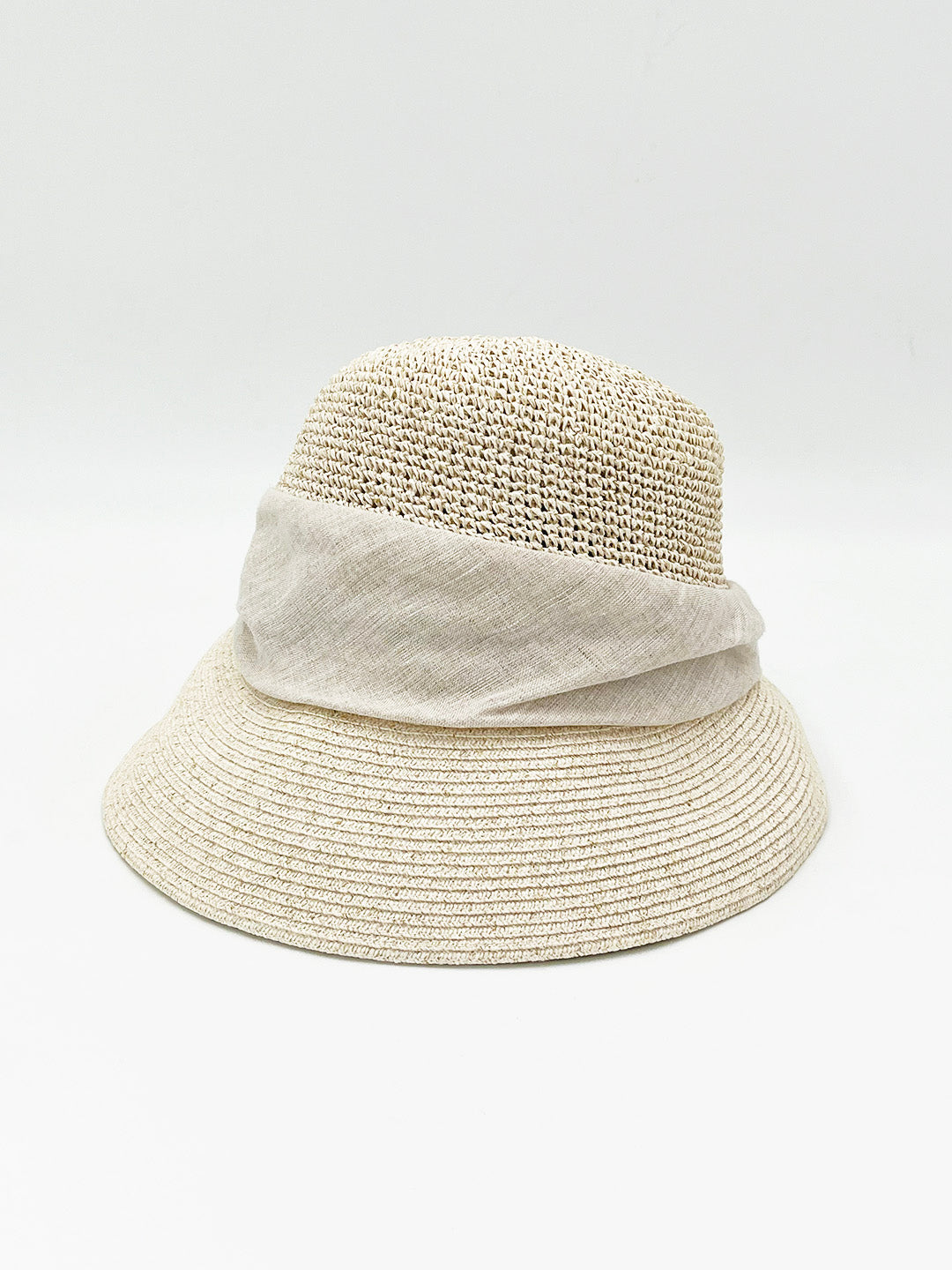 クラウンを細編みにして庇がブレード、腰は麻生地でドレープのアクセント。このハットが洗えるなんて嬉しいかぎり!