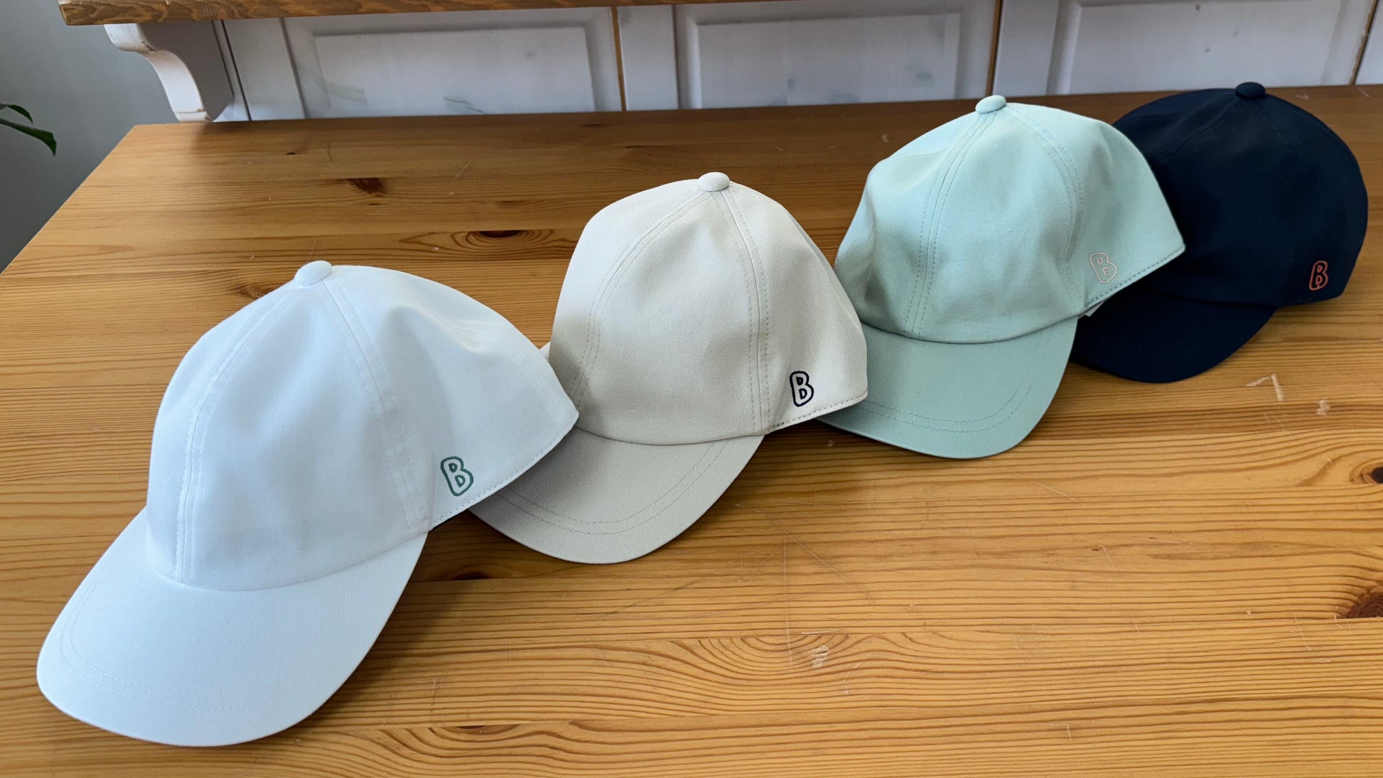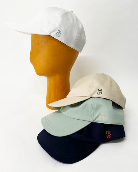 Bのロゴ刺繍キャップ。ポップな配色でそろえました。シンプルで被りやすいキャップです。