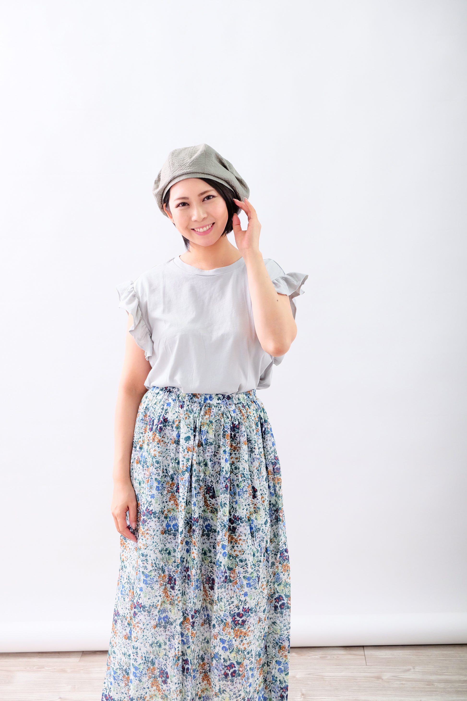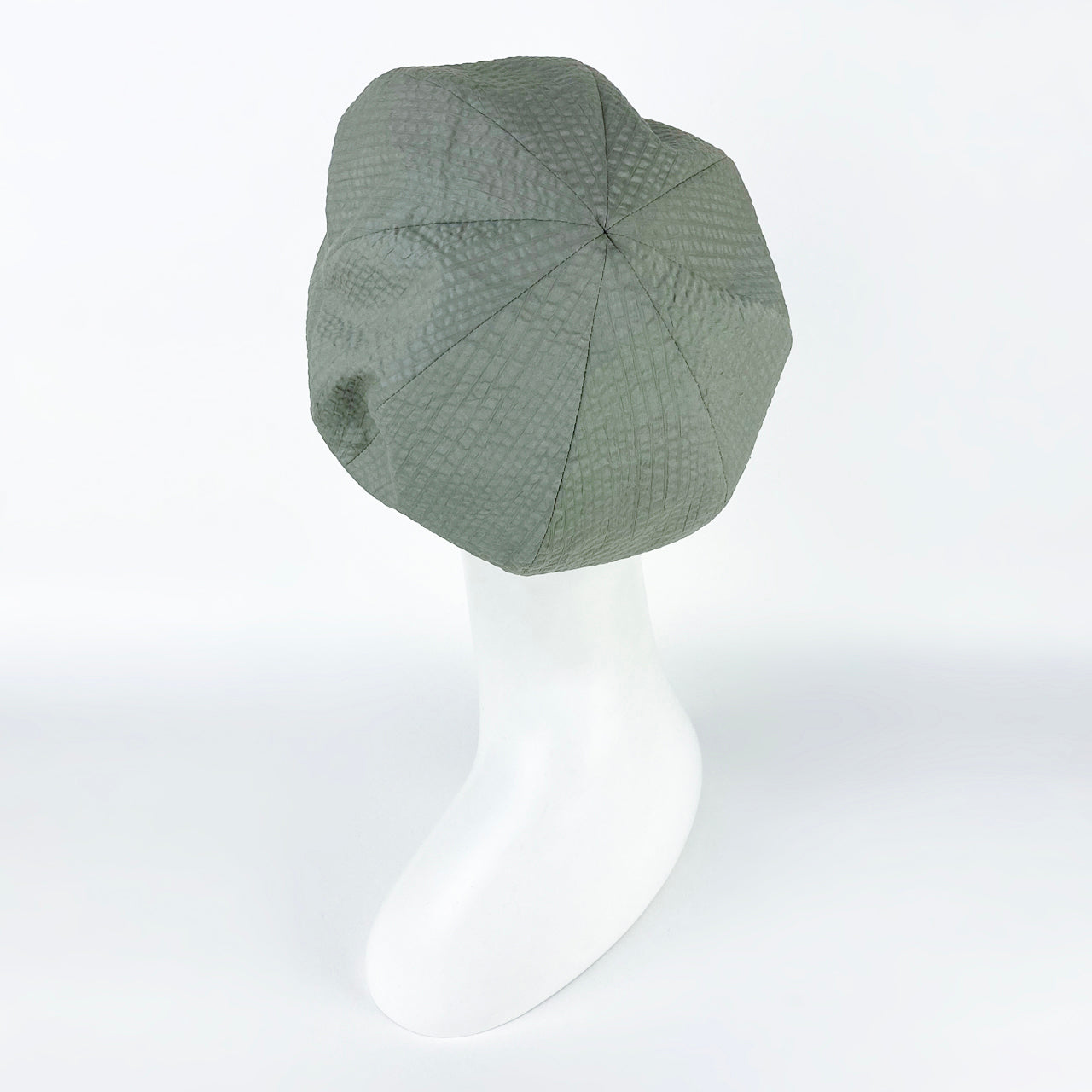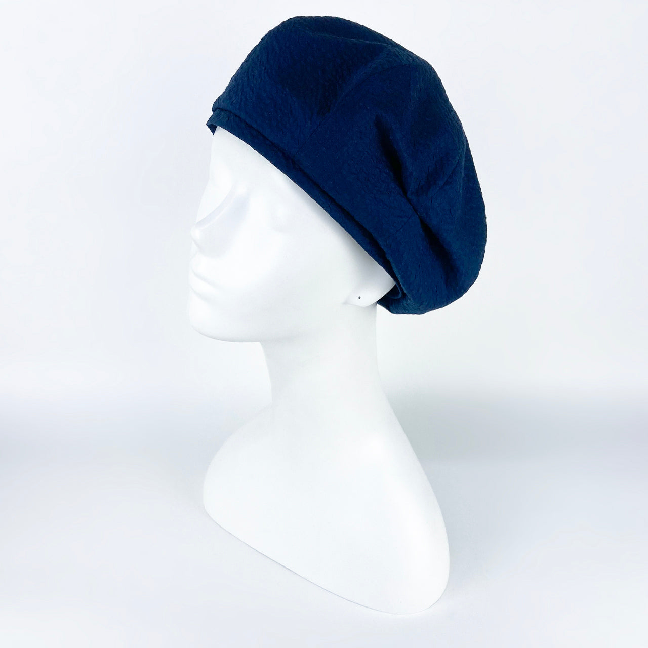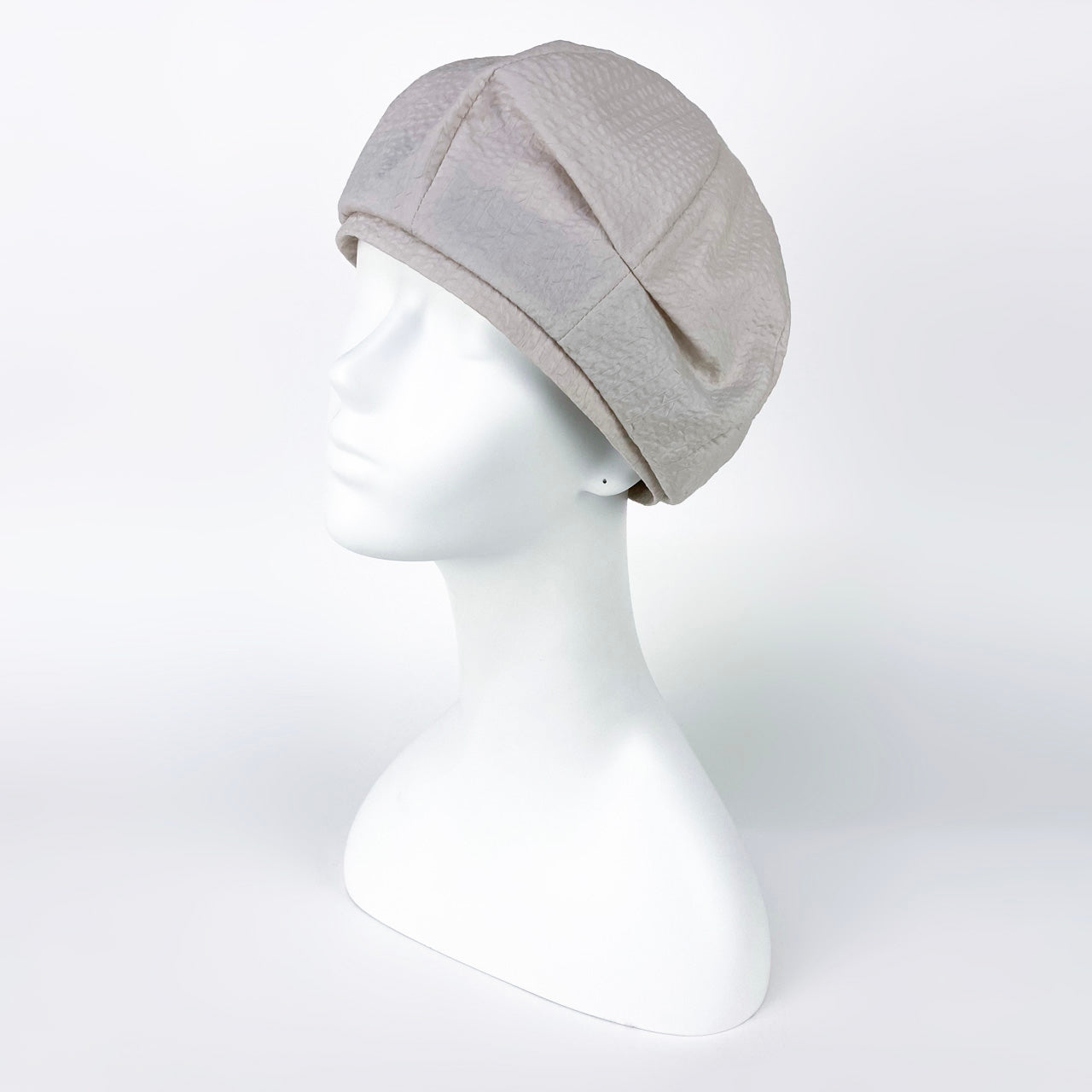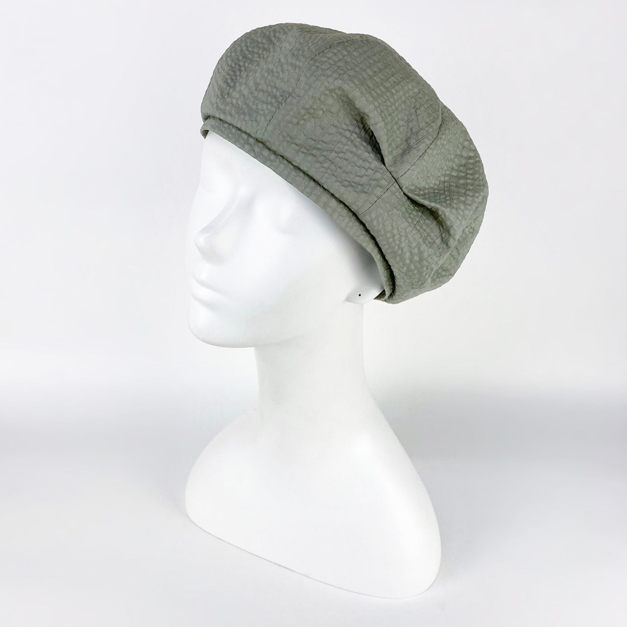 綿ローンの生地を使った軽いベレー。サイドにタックが入っているのでアシンメトリーになっています。お家帽子にもおすすめ。(布帛ベレー)