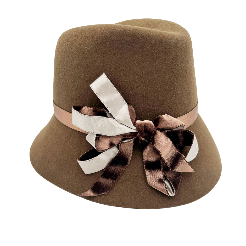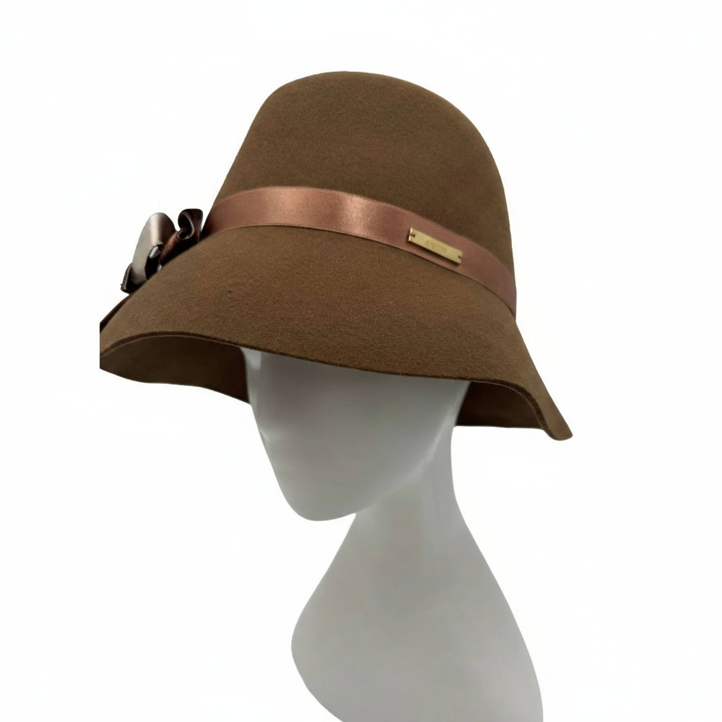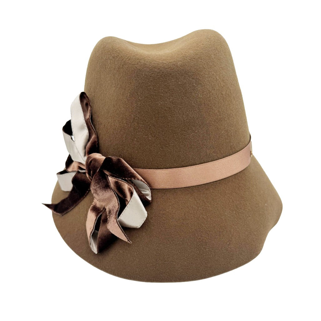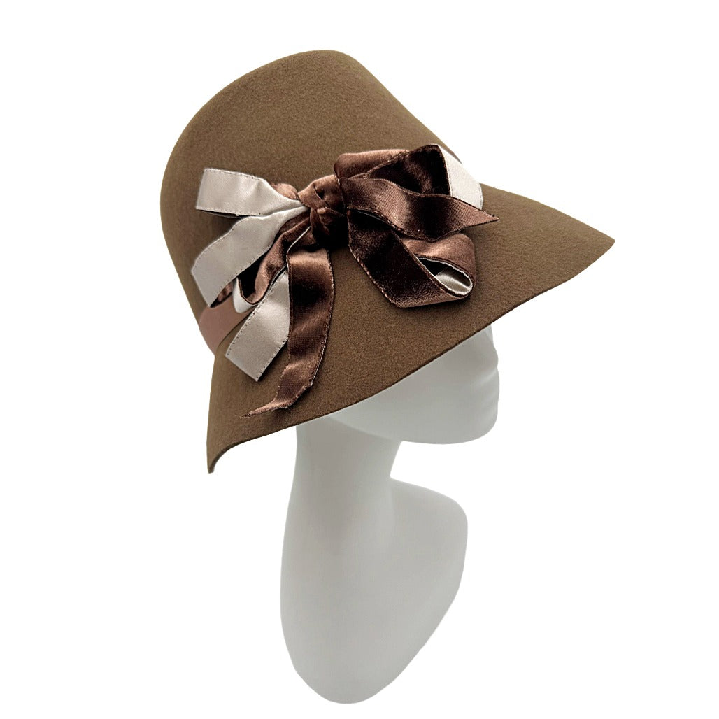 オリジナルの木型で作られたクラウン部分は、長時間着用しても疲れにくく、被った瞬間から自然に馴染むデザイン。ブリムラインをハイバック仕上げにし、小柄な方にもすっきりフィットします。秋冬のコーディネートに合わせやすい仕様で、シルクサテンと光沢あるベルベットのリボン飾りがマニッシュなシルエットに優雅な雰囲気をプラスし、唯一無二の存在感を演出します。
