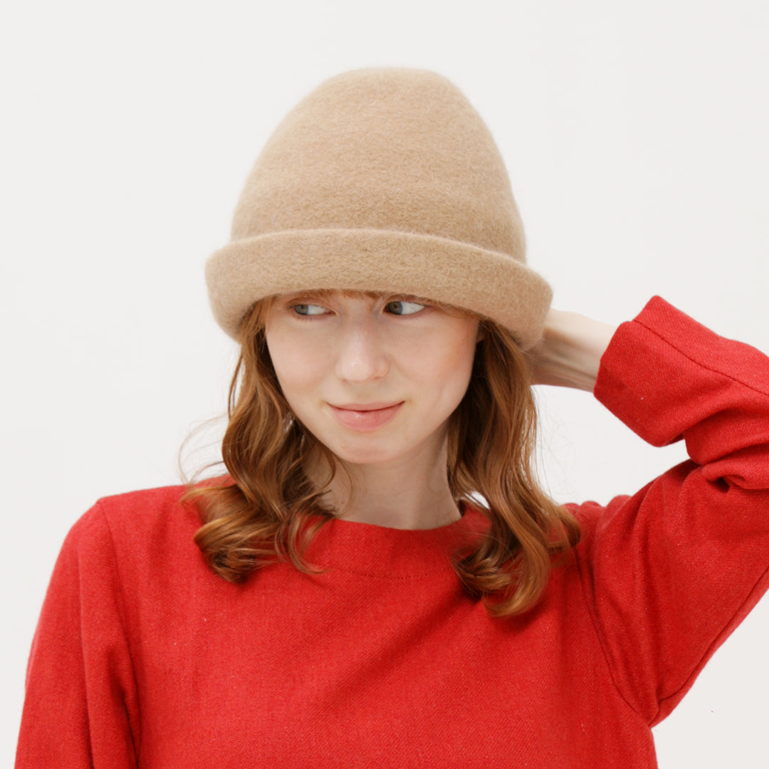 アンゴラ混のコーン型ハット。少しマニッシュさもありカジュアルに取り入れやすい型です。