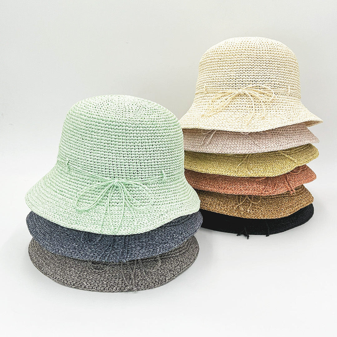 通気性のある手編みつばハット。同素材で編まれたリボンがアクセント。 寝て収納でき、通気孔で熱を逃がしつつ日差しを確保、春夏に便利な一品です。