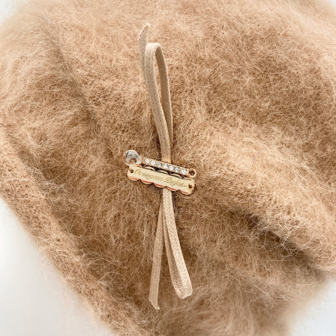 アンゴラに合皮テープ、ブランドチャーム、ビーズを付けたロングシャロット。自由に被って暖かい。