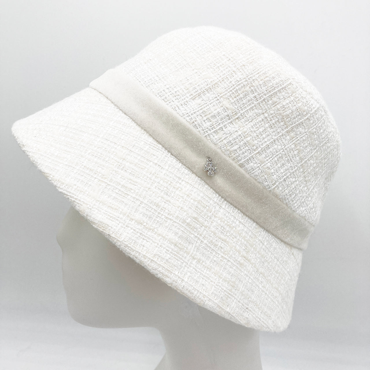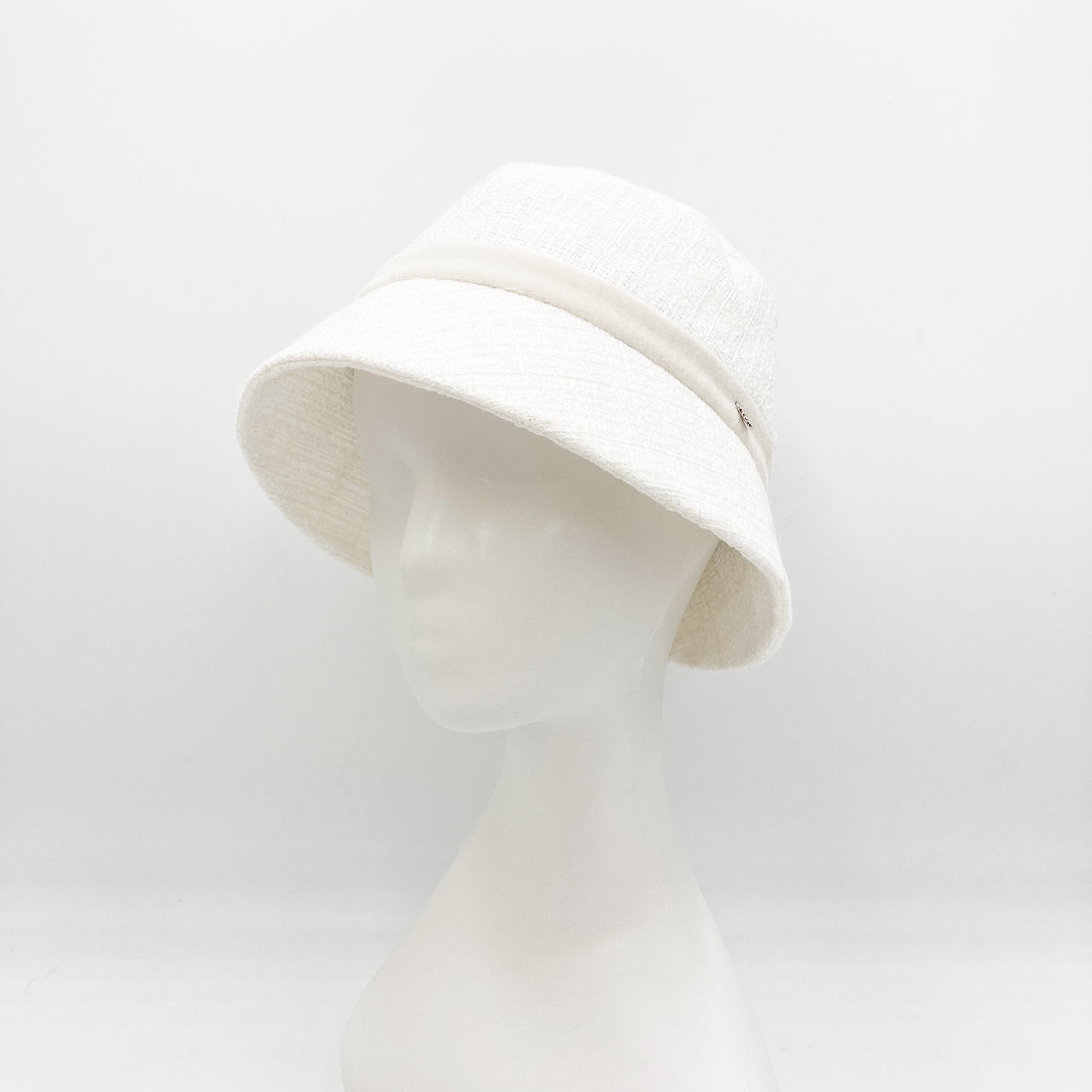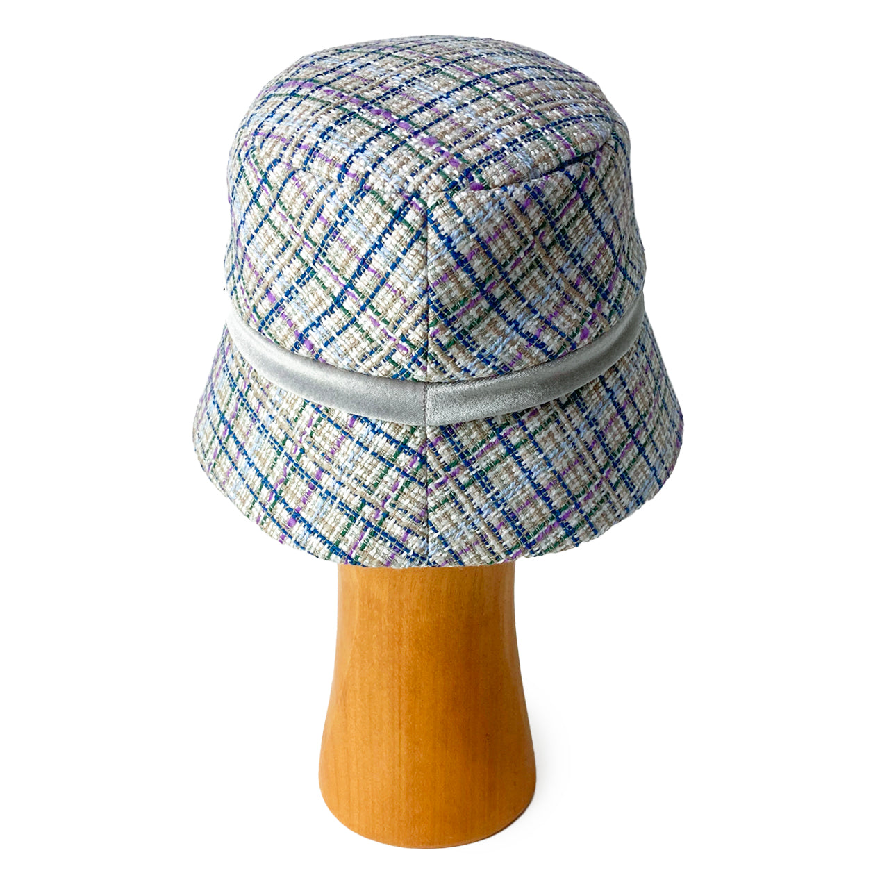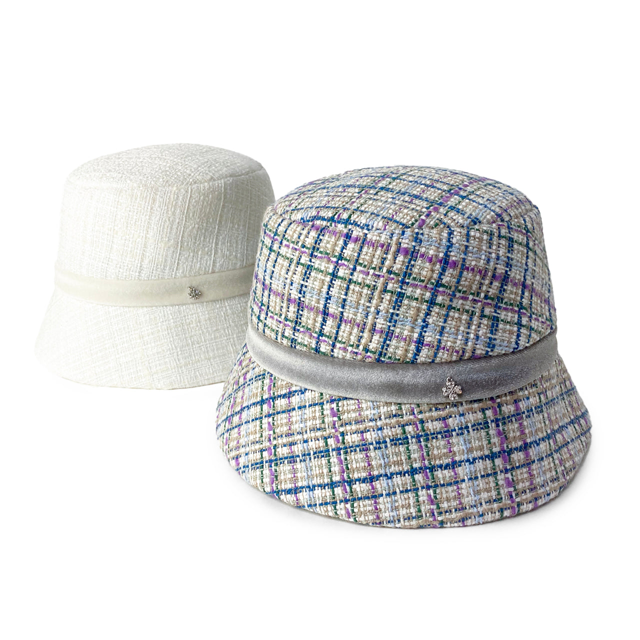 スラブツイードの生地とベロアを組み合わせたフェミニンイメージのバケットハット。綺麗めコーディネイトのアクセントにぴったり。