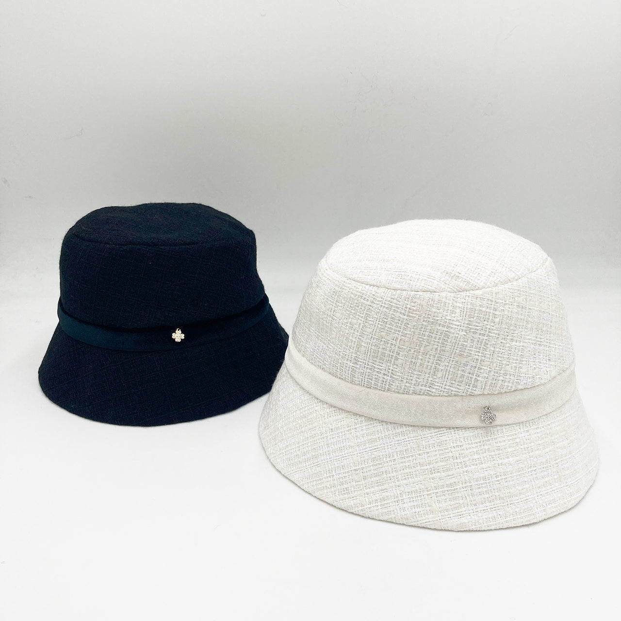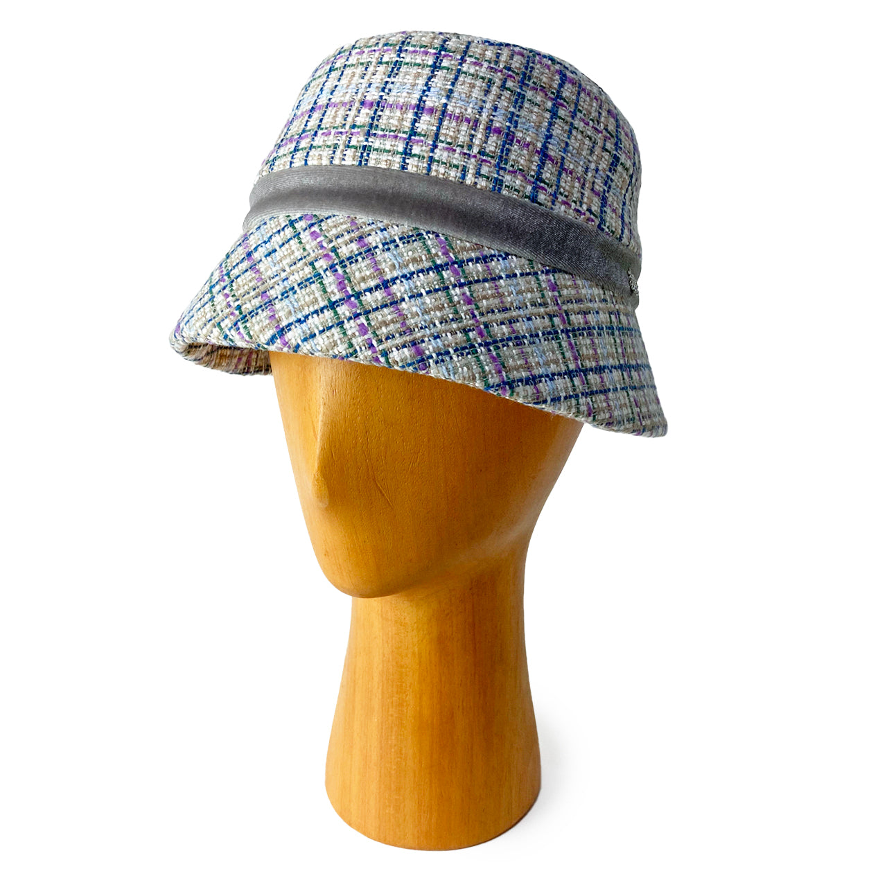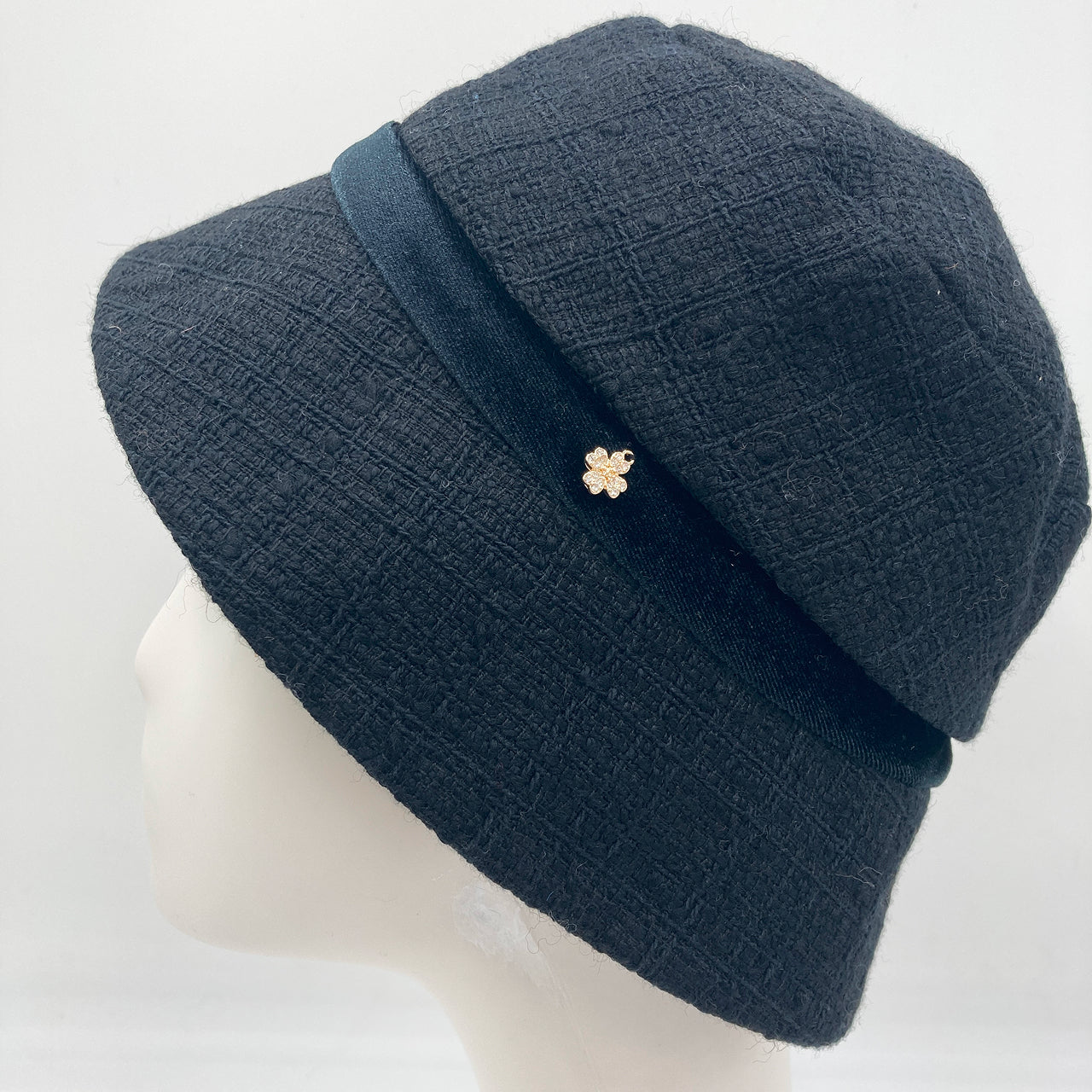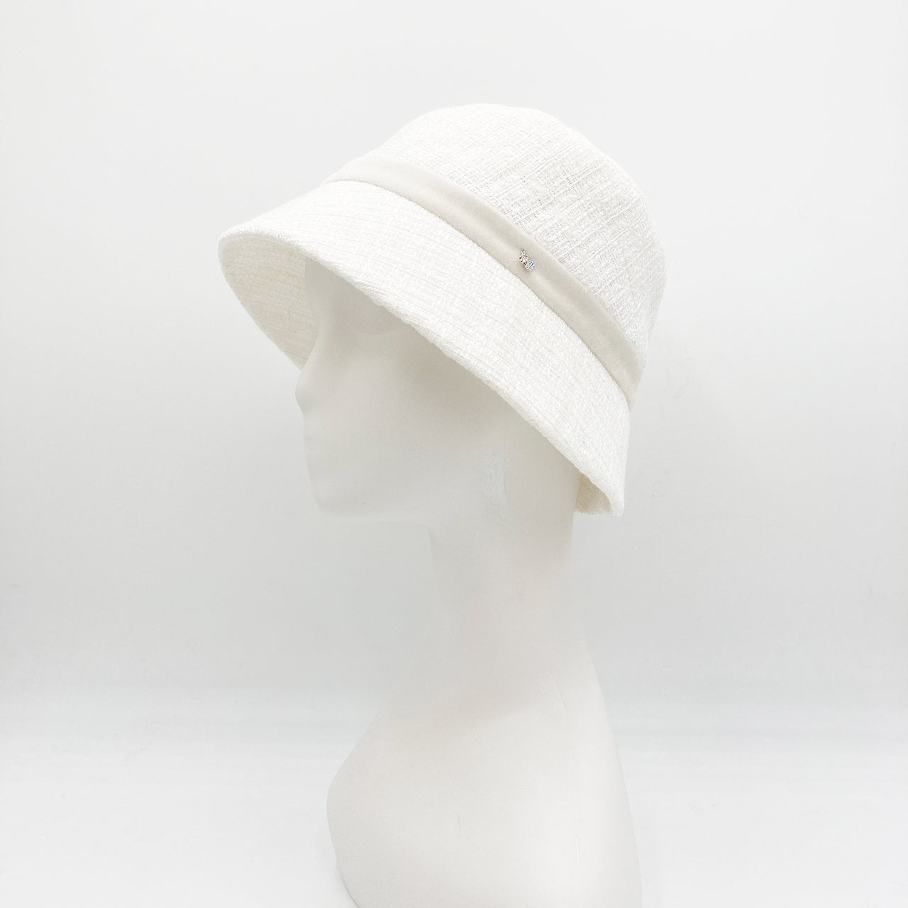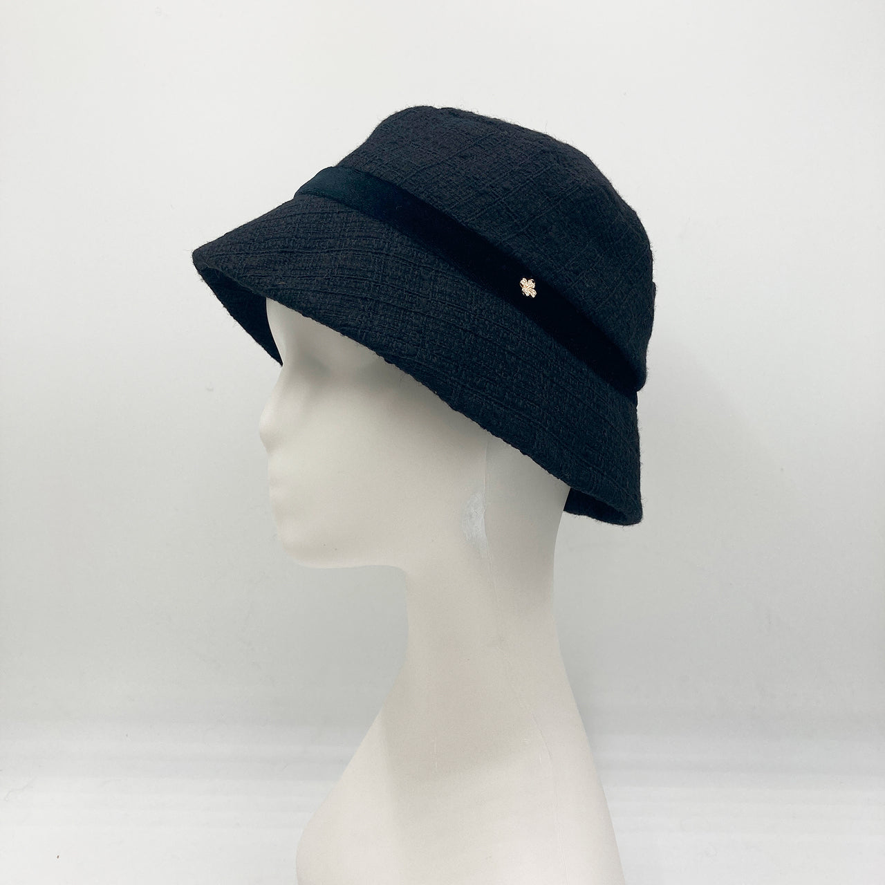 スラブツイードの生地とベロアを組み合わせたフェミニンイメージのバケットハット。綺麗めコーディネイトのアクセントにぴったり。