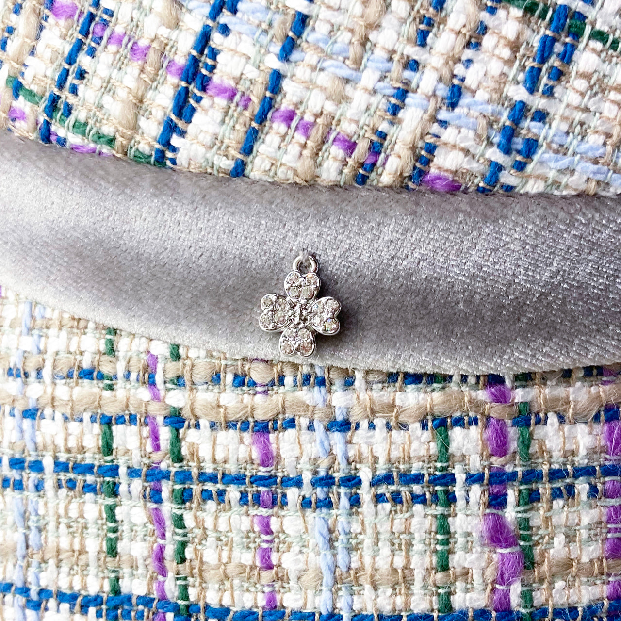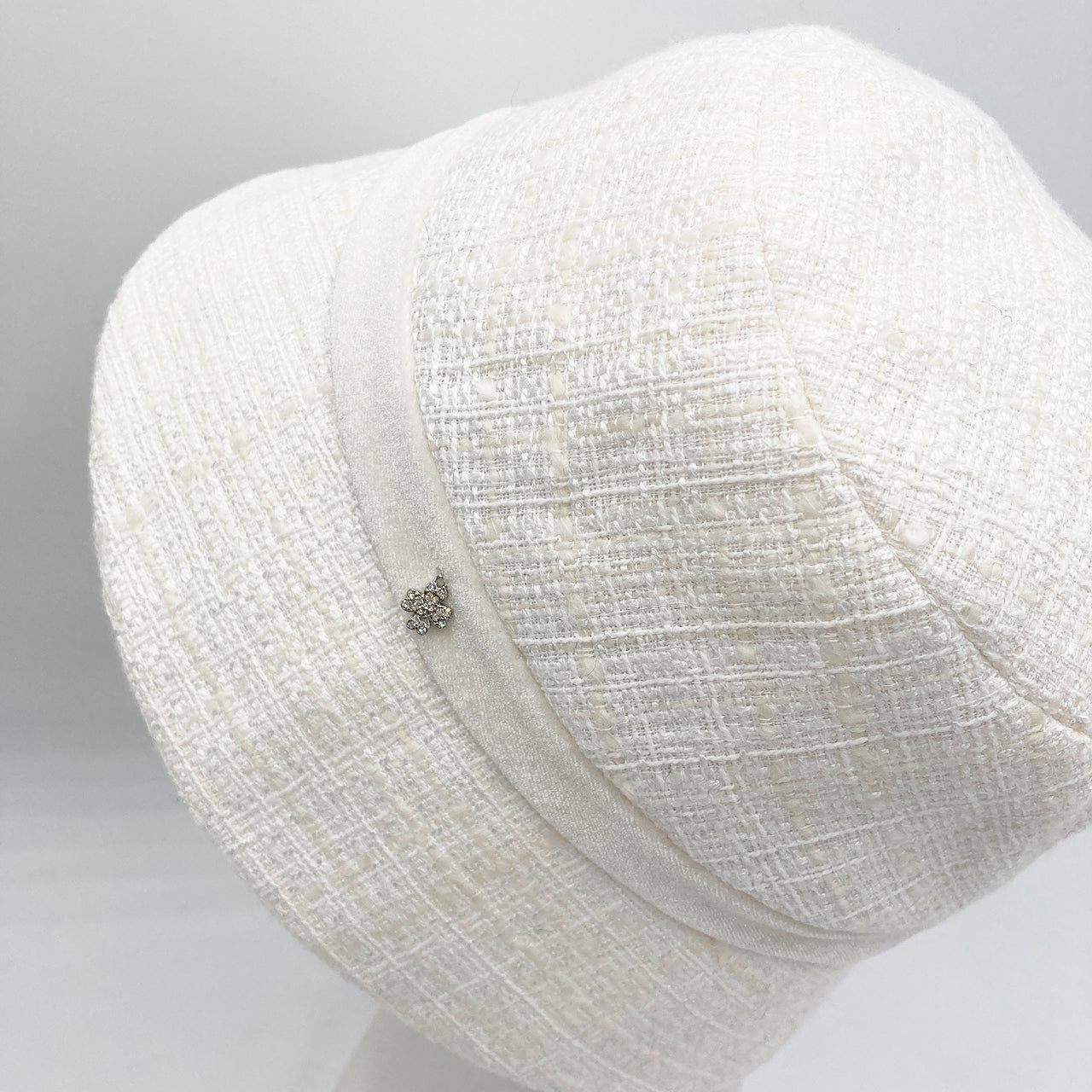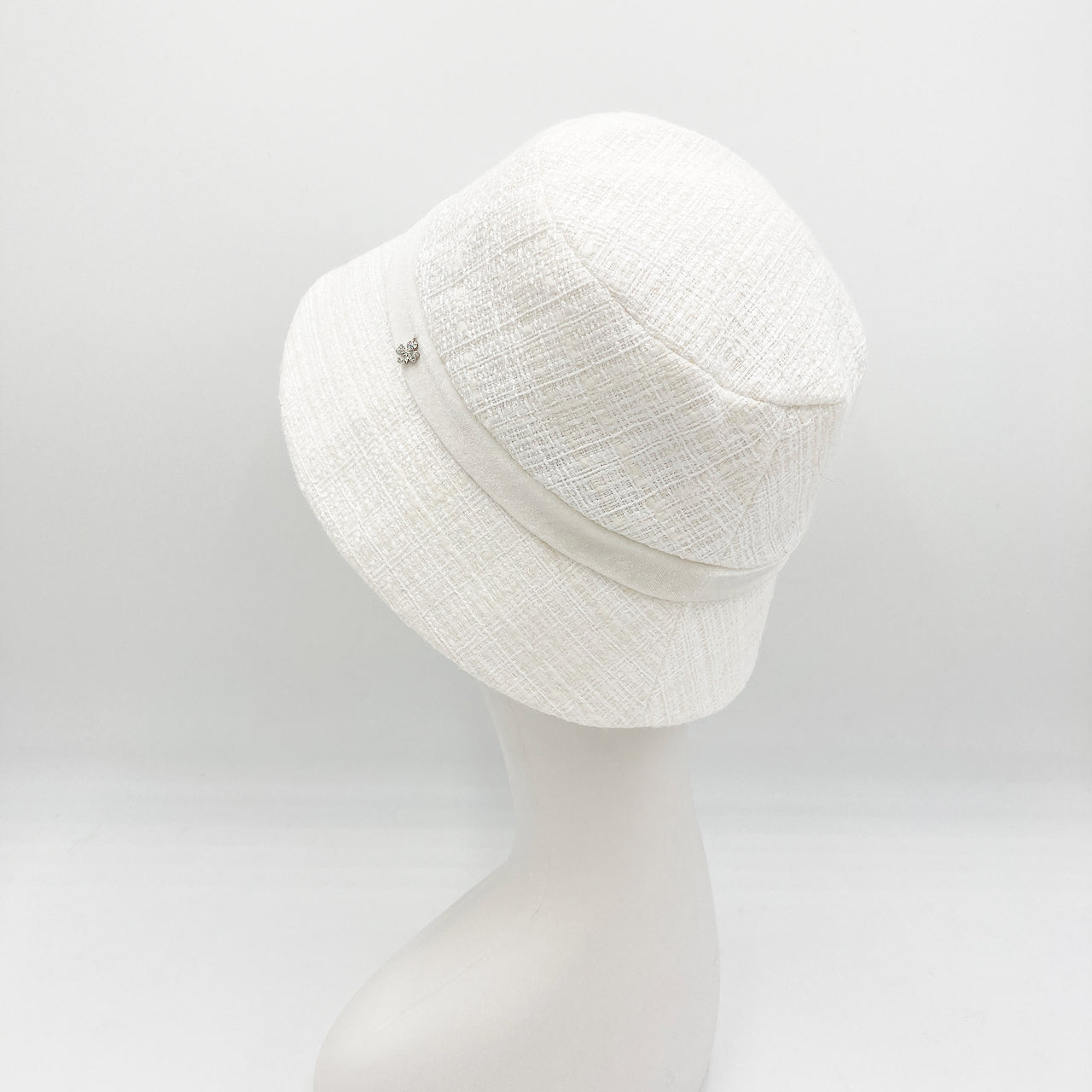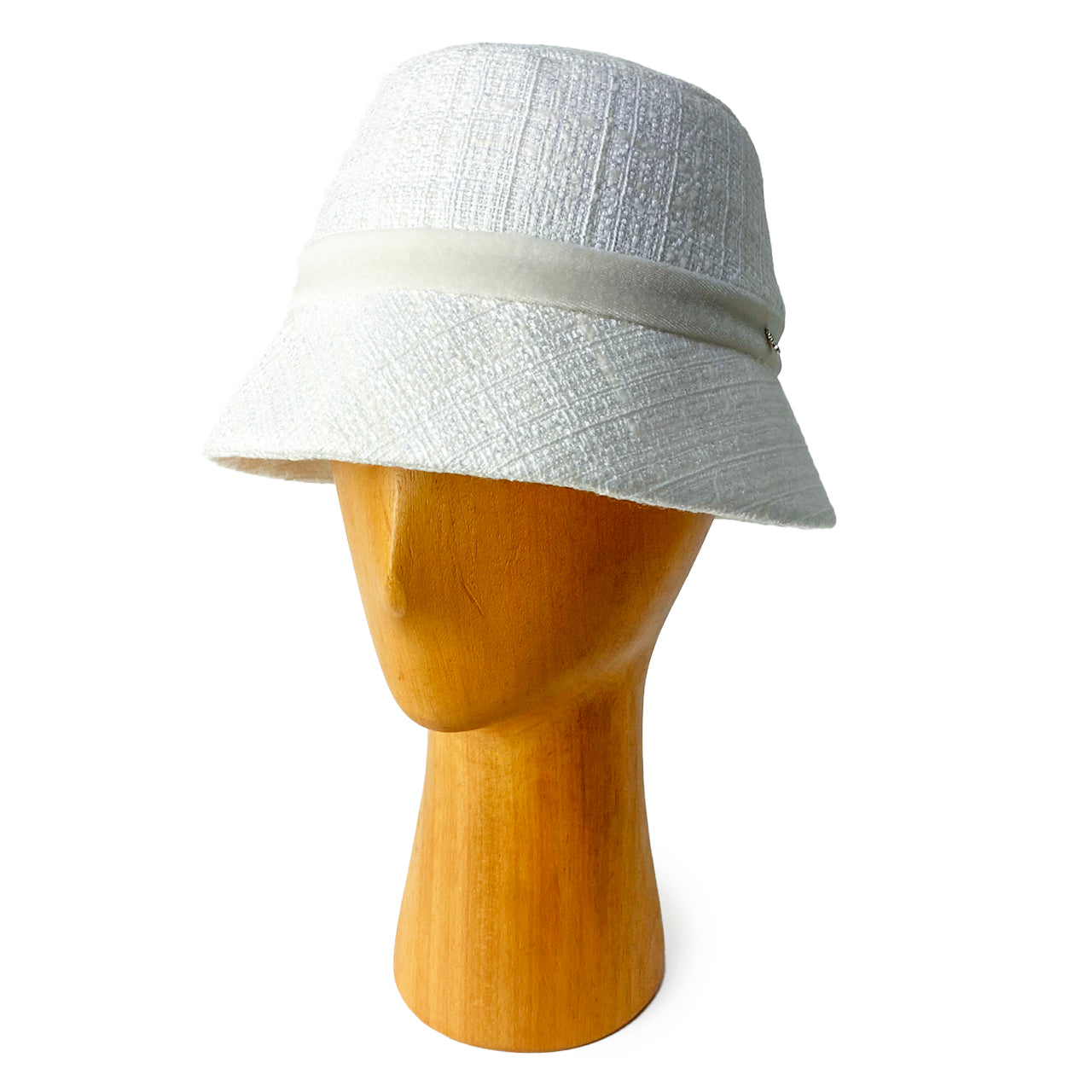 スラブツイードの生地とベロアを組み合わせたフェミニンイメージのバケットハット。綺麗めコーディネイトのアクセントにぴったり。